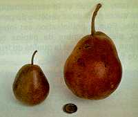 Effets de la pollinisation sur la forme et la taille des poires (à gauche bonne pollinisation, à droite pollinisation insuffisante) (photo Testolin).