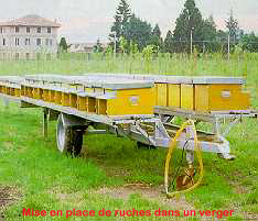 | Disposition des ruches | par groupes de 4-5 tous les 100-150 m | placer les colonies à l'intérieur du verger ou sur les tournières, l'entrée doit être orientée dans l'axe de la rangée et autant que possible vers le sud-est |
