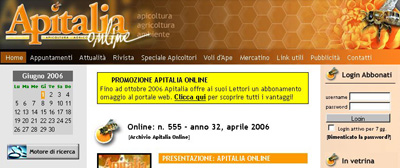 Le api ... “alla conquista” di Internet. E’ nato “Apitalia on line”, il nuovo sito della rivista Apitalia - all’indirizzo www.apitalia.net - dedicato al mondo dell’apicoltura. Una vera e propria versione telematica della redazione, un portale dinamico che adotta tecnologie all’avanguardia. Per i naviganti, tutto ciò si traduce nella possibilità di essere aggiornati in tempo reale su tutte le novità del settore. Dagli speciali alle notizie di attualità, dalle mostre ai corsi, senza trascurare le storie degli apicoltori, i veri protagonisti. Con in più, la possibilità di inviare un commento agli articoli. Tra le sezioni più curiose, un indice degli appuntamenti in tutta Italia, dedicati al settore, ed un mercatino, in corso di allestimento, con gli annunci per vendere o comprare. “La realizzazione del nuovo portale informativo è il completamento di una operazione di rinnovamento e ottimizzazione delle risorse dedicata ai lettori e agli appassionati del mondo dell’apicoltura. Uno strumento per far crescere l’apicoltura con l’aiuto degli apicoltori” ha dichiarato Fabio Marucchi, editore di Apitalia. |