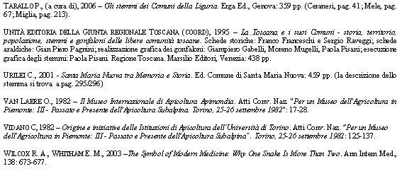 A conclusione di questa “carrellata” (forse incompleta) si evidenzia come in gran parte degli stemmi individuati (52 pari all’85 %) siano riportate api operaie (fig. 62): questo è un uso abbastanza comune nell’araldica civica internazionale; infatti, solo eccezionalmente è rappresentata la regina (VAN LAERE, 1982). E’ corretto, però, dire che le api, come del resto ogni altro insetto, sono abbastanza rare in araldica, soprattutto in quella più antica. Per quanto attiene all’araldica gentilizia, esse sono un po' più frequenti, ma sempre rare (SAVORELLI, com. pers.). In Italia la famiglia più famosa che ha le api nel suo emblema è quella dei Barberini, da cui proveniva papa Urbano VIII: il suo stemma si vede spesso sia in Vaticano sia a Roma, come nella nota fontana di piazza Barberini. L’ape è sempre vista dal dorso e rappresentata, come avviene normalmente in araldica, montante, cioè nell’atto di salire, verso la parte alta dello stemma (capo), con le ali aperte; essa viene quasi sempre raffigurata “d’oro”, ma mai su un fiore! L’oro è il primo metallo nobile usato in araldica e raccoglie in sé ogni significato buono e glorioso: ricchezza, potenza, magnanimità, nobiltà, splendore, sovranità, prosperità, ecc. Come simbolo, in araldica, l’ape è nobilissima; essa simboleggia l’industriosità, la fatica “virtuosa”, la regolarità, la laboriosità e l’operosità degli abitanti dei Comuni interessati nonché – di questo era assertore Napoleone – la immortalità e la resurrezione. E’ quindi un simbolo molto diffuso su tutto il territorio nazionale. Da rimarcare è una notazione “mistica” della simbologia dell’ape; essa, infatti, in Occidente è anche chiamata ‘Uccello del Signore’ o ‘della Madonna’ e si può considerare un simbolo dell’anima (BIEDERMANN, 1991). Ciò è valido per quegli stemmi che uniscono l’aspetto allegorico del lavoro a quello del fedele (ad esempio quello del Comune ligure di Ceranesi, che ha l’alveare con le api intorno, simboliche del popolo laborioso per il bene comune sul quale veglia, in alto, il monogramma di Maria). Gli usi delle api negli stemmi comunali sono di due tipi: come parlanti, cioè allusive (come avviene nei rebus) al nome stesso del Comune, e allegoriche, come generico simbolo di laboriosità, industriosità, abbondanza ecc. Questo secondo uso è presente in vari Comuni, ma è sempre moderno. Per quanto riguarda le api parlanti si ricordano Avigliana (TO), Melazzo (AL), Mele (GE), Cassina de’ Pecchi (MI), Melara (RO), Pietramelara (CE), Melissano (LE), Melissa (KR), Melilli (SR) e Avola (SR). Tra questi, si sottolinea Melara e Melilli che devono il loro nome al miele e all’attività delle api: ciò è motivo d’orgoglio per gli abitanti . 5 In alcuni casi (Ceranesi, GE; Piario, BG e Ornica, BG) è più corretto parlare di api alludenti, in quanto esse “fanno pensare”, per assonanza, al toponimo. Quando le api rappresentano una risorsa del territorio, ciò è evidenziato sullo stemma: questo, infatti, contiene gli elementi più significativi per identificare il comune. Solo in due casi (3,3%), grazie alle scritte interne o esterne, si fa riferimento al miele; l’alveare (o un suo favo) è, invece, rappresentato in 7 stemmi (11.7%) a testimoniare che, fin dall’antichità, in quelle terre si praticava l’apicoltura. Last but not least, ci si permette di esprimere un giudizio sulla rappresentazione grafica, delle api, in uso in araldica. Le api sono state trattate molto male dagli araldisti. Spesso, infatti, la morfologia di questi insetti non è rispettata (FRILLI et al., 2001): essi, più che api, sembrano mosche! Quest’affermazione si basa su due constatazioni. La prima è che, sovente, si vede un paio solo d’ali; ciò trae in inganno: le api, infatti, sono Imenotteri e quindi hanno 4 ali ma quando sono a riposo se ne vedono solo due, richiamando così le mosche che, invece, sono Ditteri (dotati di un solo paio di ali). La seconda considerazione è che anche il disegno dell’intero corpo dell’ape fa assomigliare questi insetti a mosche! 5.Già dal ‘700 nella zona di Melara, quindi non solo in quel paese, ma pure in quelli vicini, l’attività di apicoltore era diffusissima. Nel 1877 un noto maestro locale, Cesare Cugola, divulgò su di un giornale torinese un nuovo modo di costruire le arnie (RIDOLFI, in litteris). Melilli, purtroppo, a causa della massiccia industrializzazione del suo territorio, con lo spostamento dalla campagna di moltissima manodopera, ha perduto l’antica tradizione apicola, peraltro ancora diffusa negli altri centri iblei (Sortino ad esempio) (MAGNANO, 2004). |