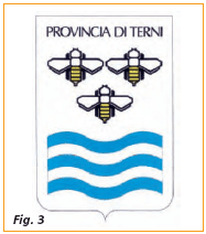 Bene ha fatto l’amministazione provinciale di Terni a procedere, qualche anno fa, ad un restyling del proprio stemma. Infatti, gli insetti riprodotti precedentemente potevano essere facilmente confusi con mosche (Fig. 1) o con vespe (Fig. 2 bis). Nell’attuale versione (Fig. 3) , invece, sono rappresentate, molto schematicamente, le tre api citate nel decreto ministeriale del 6/12/1934. Le vecchie versiono sono state utilizzate dal momento delle concessioni (la prima il 12 marzo 1936 e la seconda il 27 ottobre 1956) fino alla ridefinizione effettuata da Michele Spera nel 1987 (BUSSETTI, in litteris). Nello stemma (art. 5 dello Statuto, deliberazione n. 49 del 7/4/2003) oltre alle api, simbolo della laboriosità della comunità provinciale, si ritrovano anche cinque “onde”; esse ricordano l’acqua, risorsa fondamentale per lo sviluppo industriale e commerciale del territorio.4 4.Nel 1927 (ottanta anni fa) la Provincia di Terni fu istituita (separandola dalla Provincia dell'Umbria smembrata nelle tre attuali Province di Perugia, Terni e Rieti) accorpandola con l'area orvietana, proprio in seguito allo sviluppo della città, conseguente alla grande industralizzazione di fine secolo. |
