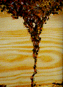 ![]() | La costruzione del favo naturale ha inizio di solito dall'alto e si origina in due-tre punti diversi mentre gli angoli inferiori pendono liberamente e si restringono a forma di U. Nella costruzione, le api, formano catene a gruppi compatti ,all'interno la temperatura si mantiene sui 35° necessaria per modellare la cera. | |