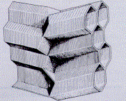 La costruzione comincia a partire da una base a forma di cuspide con tre losanghe inclinate di 109°28' , su cui le api premendo contemporaneamente ai lati innalzano le pareti cellulari a forma esagonale,con un inclinazione tra i 9 e 13 gradi, sufficiente a impedire il deflusso del miele liquido immagazzinato nelle celle. | ||