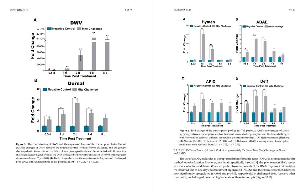 Dorsal, un fattore di trascrizione associato all’espressione attiva di molecole a valenza immunitaria ( effettori ), è stato precedentemente associato ( direttamente correlato ) ad alti livelli di infestazione da varroa e ad alta concentrazione di DWV [20]. In questo studio si è mostrato che il livello di trascrizione di Dorsal aumenta fino al doppio del livello precente l’inizio del contatto con varroa 0,5 giorni dopo l’inizio della prova fino a raggiungere un massimo pari a circa sei volte il livello espresso in assenza di varroa due giorni dopo l’innizio della prova . Successivamente il livello comincia a calare . In parallelo il livello di DWV aumenta (Figure 1).