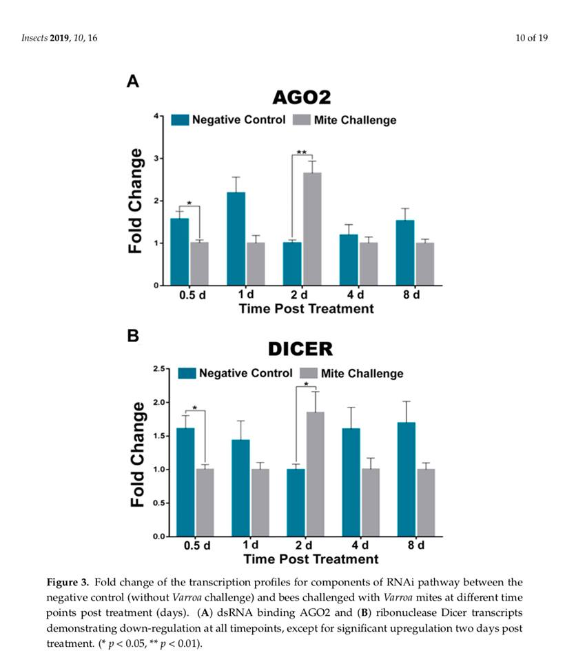 Fatta eccezione per la misura fatta al secondo giorno dall’inizio dell’infestazione l’espressione di argonaute 2 (AGO2) e di ribonuclease (DICER) risulta diminuire nelle api parassitizzate da varroa verosimilmente significando che detta patassitizzazione “ spegne “ il sistema di difesa RNAi (Figure 3A,B).