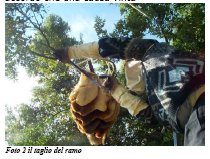 Il ramo fu poi legato con una fune che fu fatta passare su un altro ramo, posto più in alto del nido, che avrebbe avuto la funzione di carrucola. Poi con una comune forbice per potare fu isolato il nido d’api da tutti gli altri ramoscelli e il ramo da altri rami che potevano ostacolare la discesa del complesso ramo-nido a terra. Infine si procedette al taglio del ramo con una sega ( foto 2) e fu scarrucolato verso il basso con estrema dolcezza per non far cadere le api che vi erano sopra, fermandolo a circa un metro dal terreno, per poter lavorare a ridosso del nido comodamente senza problemi.