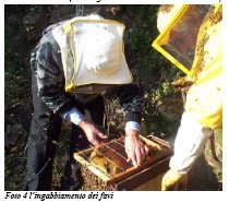 Furono tagliati prima i favi vuoti, senza le api sopra, e raccolti in un recipiente per non rischiare di innescare un saccheggio, fino ad arrivare ai favi interni, dove le api avevano già formato il glomere a causa della temperatura già fredda in quella zona. Sono stati poi tagliati i favi con tutte le api sopra delicatamente per non farli cadere a terra (foto 3) e procedendo al loro ingabbiamento in un telaino da nido vuoto, rispettando sempre la posizione naturale che aveva all’interno del nido, ed inseriti nel pigliasciame (foto 4).