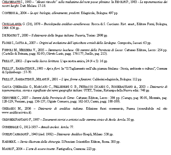 A conclusione di questa “carrellata” (forse incompleta) si evidenzia come in gran parte degli stemmi individuati (52 pari all’85 %) siano riportate api operaie (fig. 62): questo è un uso abbastanza comune nell’araldica civica internazionale; infatti, solo eccezionalmente è rappresentata la regina (VAN LAERE, 1982). E’ corretto, però, dire che le api, come del resto ogni altro insetto, sono abbastanza rare in araldica, soprattutto in quella più antica. Per quanto attiene all’araldica gentilizia, esse sono un po' più frequenti, ma sempre rare (SAVORELLI, com. pers.). In Italia la famiglia più famosa che ha le api nel suo emblema è quella dei Barberini, da cui proveniva papa Urbano VIII: il suo stemma si vede spesso sia in Vaticano sia a Roma, come nella nota fontana di piazza Barberini. L’ape è sempre vista dal dorso e rappresentata, come avviene normalmente in araldica, montante, cioè nell’atto di salire, verso la parte alta dello stemma (capo), con le ali aperte; essa viene quasi sempre raffigurata “d’oro”, ma mai su un fiore! L’oro è il primo metallo nobile usato in araldica e raccoglie in sé ogni significato buono e glorioso: ricchezza, potenza, magnanimità, nobiltà, splendore, sovranità, prosperità, ecc. Come simbolo, in araldica, l’ape è nobilissima; essa simboleggia l’industriosità, la fatica “virtuosa”, la regolarità, la laboriosità e l’operosità degli abitanti dei Comuni interessati nonché – di questo era assertore Napoleone – la immortalità e la resurrezione. E’ quindi un simbolo molto diffuso su tutto il territorio nazionale. Da rimarcare è una notazione “mistica” della simbologia dell’ape; essa, infatti, in Occidente è anche chiamata ‘Uccello del Signore’ o ‘della Madonna’ e si può considerare un simbolo dell’anima (BIEDERMANN, 1991). Ciò è valido per quegli stemmi che uniscono l’aspetto allegorico del lavoro a quello del fedele (ad esempio quello del Comune ligure di Ceranesi, che ha l’alveare con le api intorno, simboliche del popolo laborioso per il bene comune sul quale veglia, in alto, il monogramma di Maria). Gli usi delle api negli stemmi comunali sono di due tipi: come parlanti, cioè allusive (come avviene nei rebus) al nome stesso del Comune, e allegoriche, come generico simbolo di laboriosità, industriosità, abbondanza ecc. Questo secondo uso è presente in vari Comuni, ma è sempre moderno. Per quanto riguarda le api parlanti si ricordano Avigliana (TO), Melazzo (AL), Mele (GE), Cassina de’ Pecchi (MI), Melara (RO), Pietramelara (CE), Melissano (LE), Melissa (KR), Melilli (SR) e Avola (SR). Tra questi, si sottolinea Melara e Melilli che devono il loro nome al miele e all’attività delle api: ciò è motivo d’orgoglio per gli abitanti . 5 In alcuni casi (Ceranesi, GE; Piario, BG e Ornica, BG) è più corretto parlare di api alludenti, in quanto esse “fanno pensare”, per assonanza, al toponimo. Quando le api rappresentano una risorsa del territorio, ciò è evidenziato sullo stemma: questo, infatti, contiene gli elementi più significativi per identificare il comune. Solo in due casi (3,3%), grazie alle scritte interne o esterne, si fa riferimento al miele; l’alveare (o un suo favo) è, invece, rappresentato in 7 stemmi (11.7%) a testimoniare che, fin dall’antichità, in quelle terre si praticava l’apicoltura. Last but not least, ci si permette di esprimere un giudizio sulla rappresentazione grafica, delle api, in uso in araldica. Le api sono state trattate molto male dagli araldisti. Spesso, infatti, la morfologia di questi insetti non è rispettata (FRILLI et al., 2001): essi, più che api, sembrano mosche! Quest’affermazione si basa su due constatazioni. La prima è che, sovente, si vede un paio solo d’ali; ciò trae in inganno: le api, infatti, sono Imenotteri e quindi hanno 4 ali ma quando sono a riposo se ne vedono solo due, richiamando così le mosche che, invece, sono Ditteri (dotati di un solo paio di ali). La seconda considerazione è che anche il disegno dell’intero corpo dell’ape fa assomigliare questi insetti a mosche! 5.Già dal ‘700 nella zona di Melara, quindi non solo in quel paese, ma pure in quelli vicini, l’attività di apicoltore era diffusissima. Nel 1877 un noto maestro locale, Cesare Cugola, divulgò su di un giornale torinese un nuovo modo di costruire le arnie (RIDOLFI, in litteris). Melilli, purtroppo, a causa della massiccia industrializzazione del suo territorio, con lo spostamento dalla campagna di moltissima manodopera, ha perduto l’antica tradizione apicola, peraltro ancora diffusa negli altri centri iblei (Sortino ad esempio) (MAGNANO, 2004). |