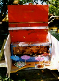 | Arnia testimone, una tra 150 nuclei di fecondazione regine ( Apicoltura Tettamanti) con voluta presenza dell' erba sottostante. | Le api sanno aggiustarsi da sole con loro mini alberi della cuccagna... |