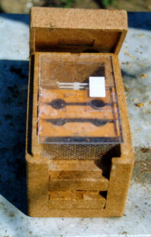 | 3) Arnietta per fecondazione regina da cella reale.. Due mini fogli cerei vengono inseriti. Su uno di loro si innesta una cella reale già chiusa...Sul retro arnia una vaschetta per nutrizione liquida con mini escludi per evitare che poi la Regina possa annegare. Sul davanti infimo spazio per le api...Un vetro resina copre il tutto per poter visitare le api . L’ingresso sul davanti è a scatto rialzo verso l’alto o verso il basso quando si trasporta l’arnietta. Giudizio tecnico. Bisognerebbe comminare l’ergastolo a chi l’ha progettata ma soprattutto a coloro che vi ricorrono.. Viene proposto di allevare-accudire una regina da poche api terribilmente stressate per un evidente complesso ambientale deficitario.. |