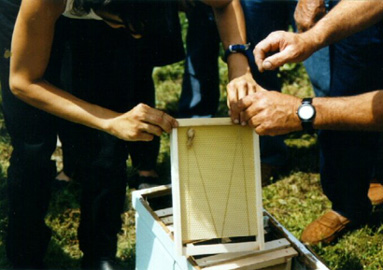 | 7 )In diretta un incollamento cella reale. Inserimento fili a supporto tela di ragno | 8) Per poter lavorare con calma le api vengono immerse velocissimamente nel contenitore di glucosio e poi subito sgocciolate sullo stesso contenitore per evitare che soffochino.. |