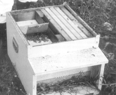 | 5) Doppia cassettina contenente solo tre fogli cerei. Un nutritore a tasca ... "Mini salone" per le api stesse. Divisione ermetica dallo scomparto attiguo. Notare dalla foto un bidone con nutrizione a glucosio di mais non scatenante il saccheggio. In basso due pacchi d’api visti con rete respiratoria | 6) |