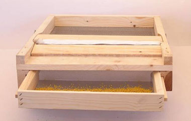 La produzione commerciale è basata sulla raccolta del polline mediante trappole poste all’entrata dell’alveare. Le api rientrando cariche sono costrette a passare attraverso fori di diametro opportunamente calibrato che determinano la caduta del polline in un cassetto sottostante. Raccolto giornalmente, il polline va essiccato a temperatura moderata, cernito e confezionato in recipienti ermetici.